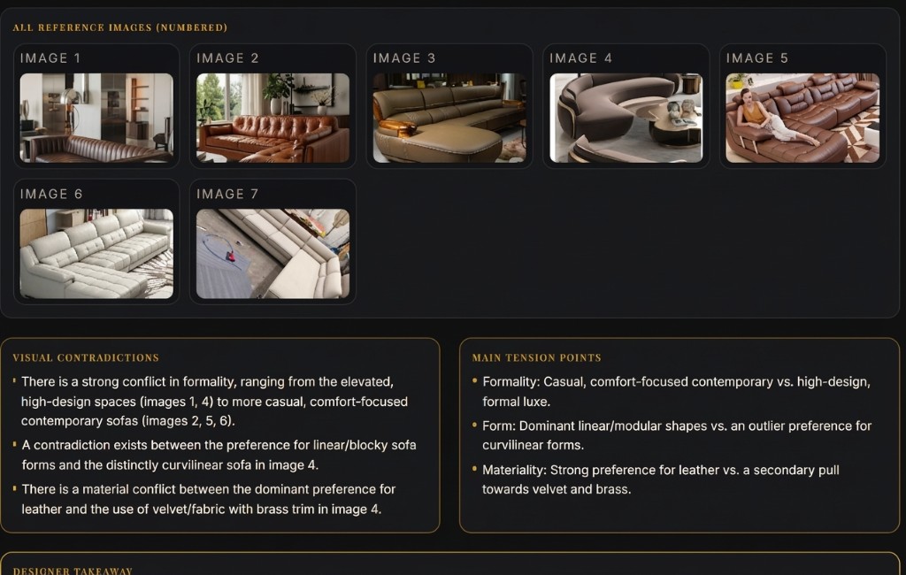The AI analyzes image patterns and preferences, surfacing style direction, conflicts, and actionable design cues.